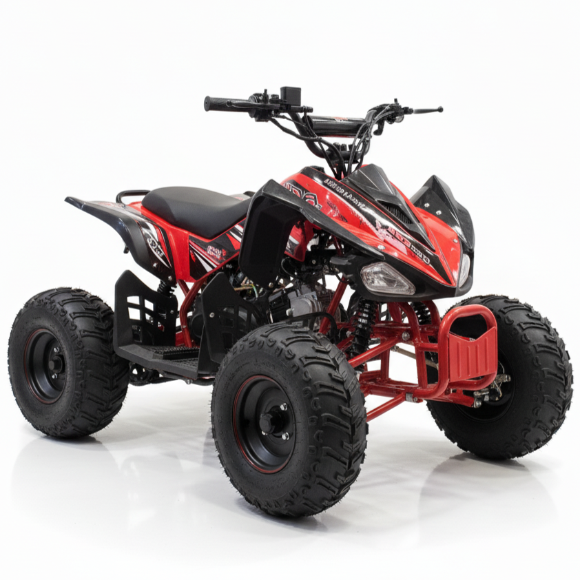 Verlichting is zowel voor als achter aanwezig, dus de quad blijft te allen tijde goed zichtbaar. De rode kleur geeft deze kinderquad op benzine een gave uitstraling. Bij ons bestel je kinderquads tegen aantrekkelijke prijzen. Bovendien bepaal je zelf of je deze quad bij ons in de winkel komt ophalen of dat de quad bij je thuisbezorgd wordt. Waar je ook voor kiest, wij zorgen ervoor dat het model geheel rijklaar geleverd wordt inclusief volle tank. Zo kan je zoon of dochter meteen gaan rijden op deze coole kinder quad.