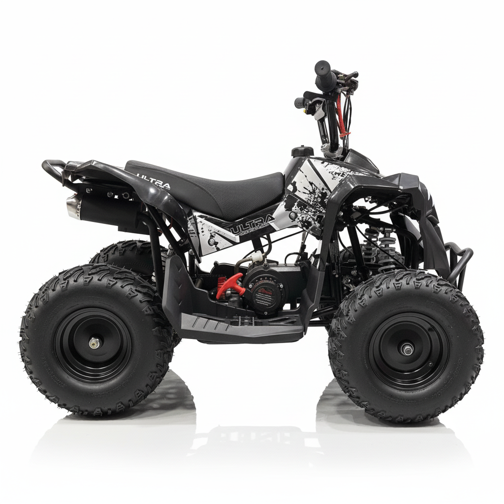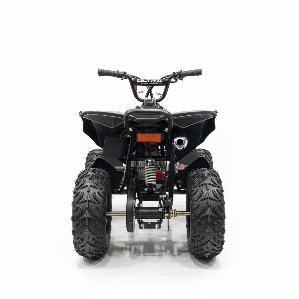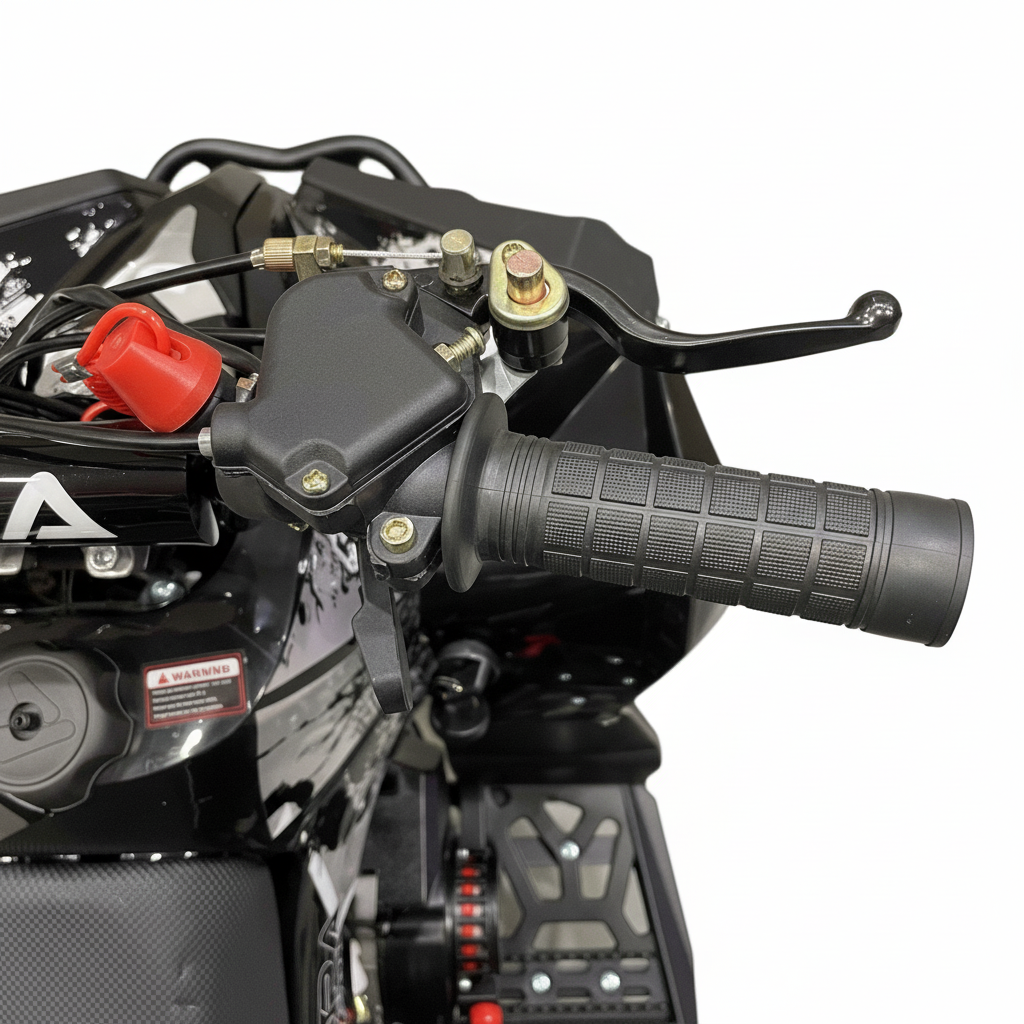 Deze ATV Kinderquad Infinity heeft een cilinderinhoud van 49CC. Bovendien is dit een 2-takt quad. Deze automatische kinderquad loopt op benzine. Het model heeft een elektrische start en een trekstarter. Het uiterlijk van dit model valt op. Hiermee bedoelen we niet alleen de stoere zwarte kleur, maar ook het supersterke frame. Deze 49CC kinderquad kan een hoop hebben. Het motorblok is van een hoog niveau en voorzien van de nieuwste technologie. Daarnaast is er een vernieuwde carburateur. Je kunt je wel voorstellen dat deze kinderquad op benzine uitmuntende prestaties levert.