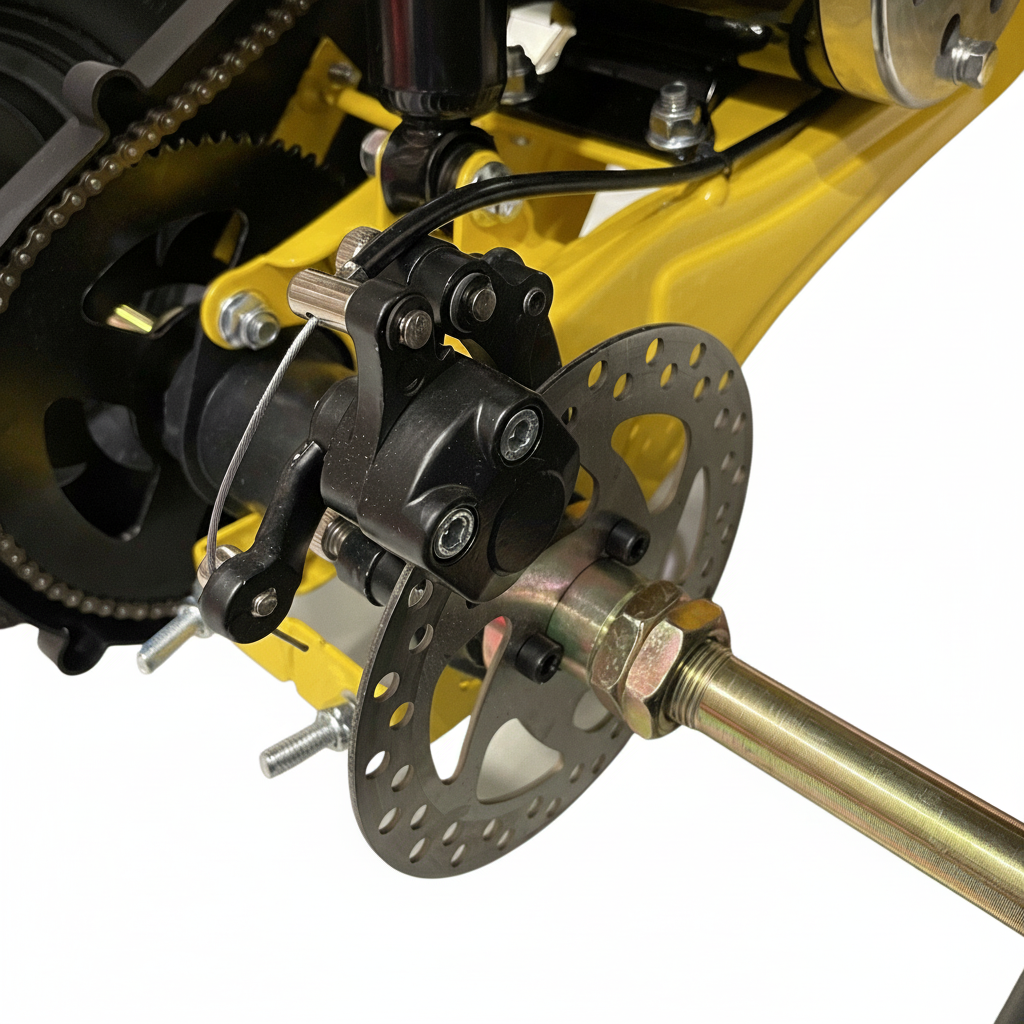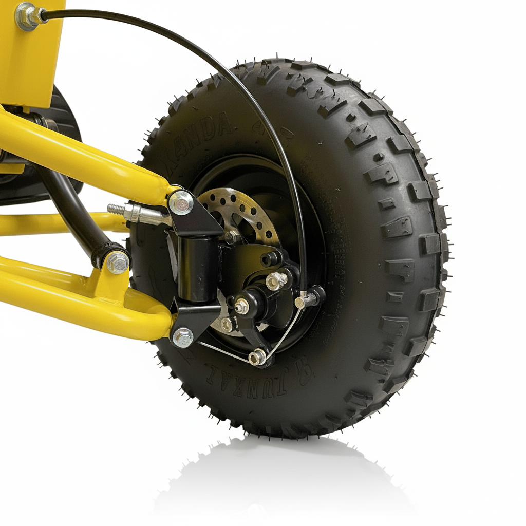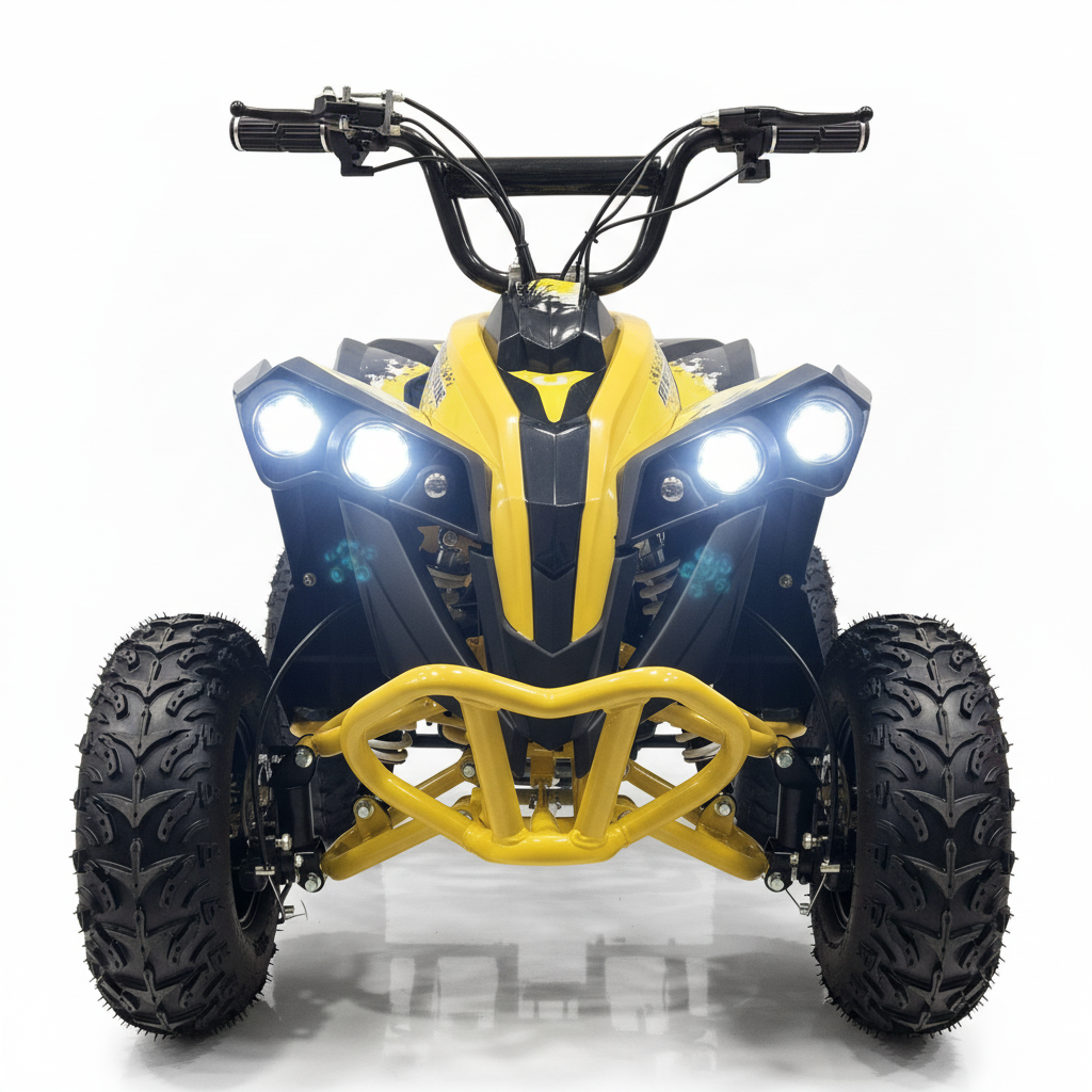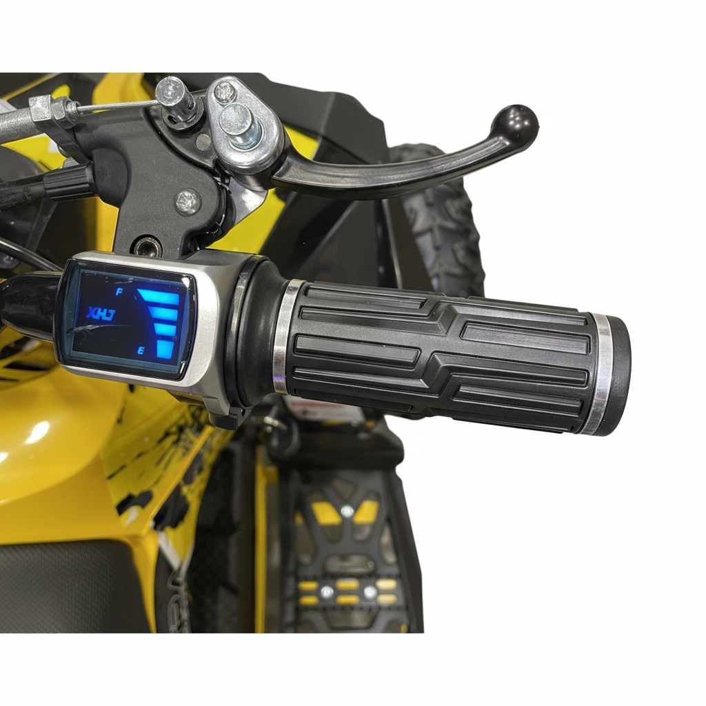 Deze elektrische kinderquad is geel van kleur. Dit ziet er fenomenaal uit. De stoere uitstraling wordt nog eens versterkt dankzij de felle ledverlichting. Bijkomend voordeel van deze verlichting is dat de quad te allen tijde goed zichtbaar is. Deze kinderquad kan zowel voor- als achteruit rijden en het is een fluitje van een cent om deze kinderquad te bedienen. Deze 1000 watt brushless kinderquad heeft ook een neutrale stand. De maximale snelheid van deze elektrische kinderquad is 30 km/u. Je kunt de maximale snelheid ook instellen op 5 km/u of 15 km/u met behulp van de uitneembare sleutel. Zo behoud je als ouder zelf de controle.