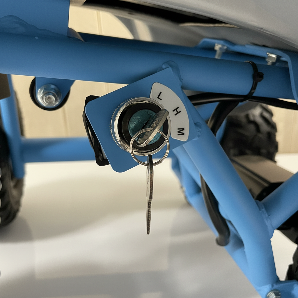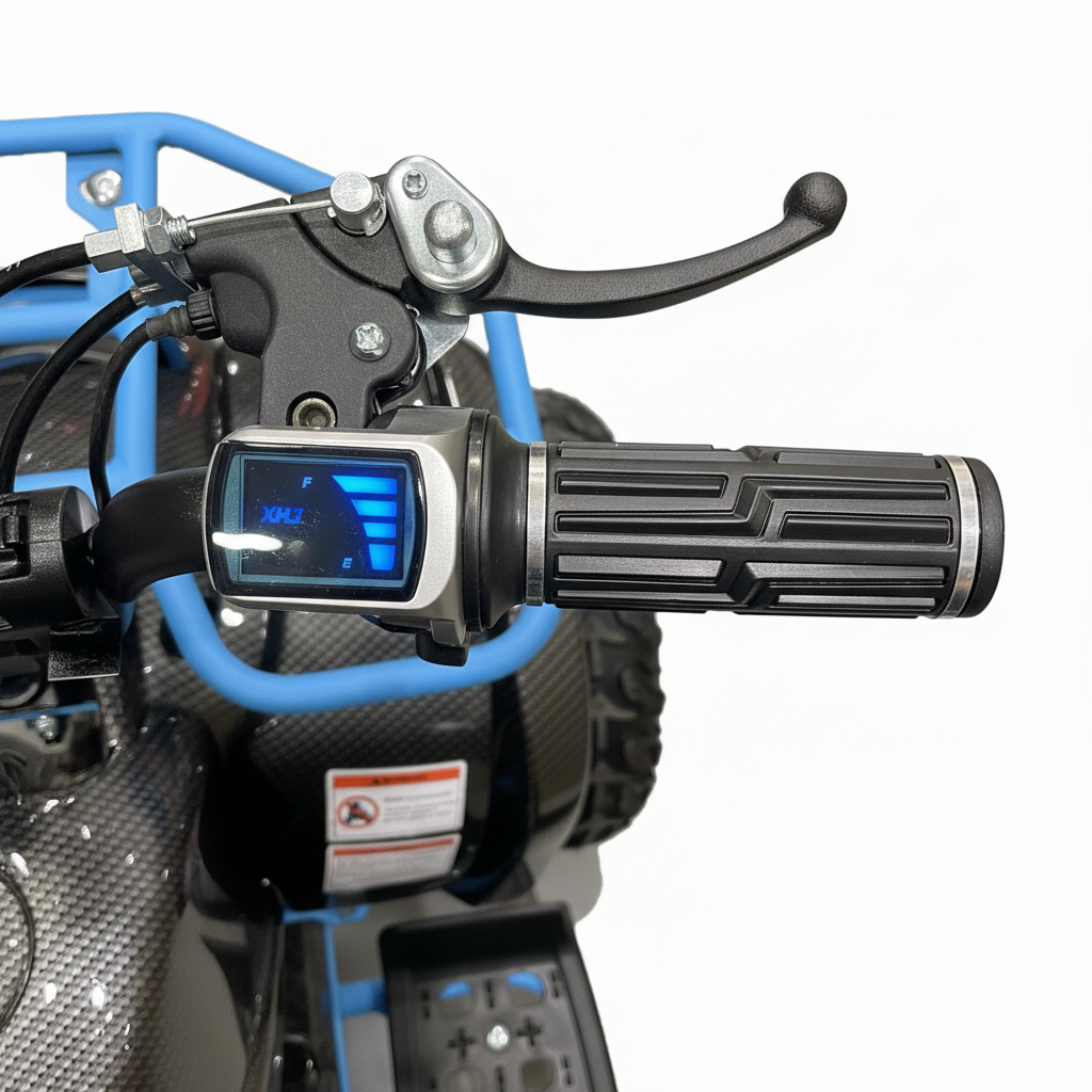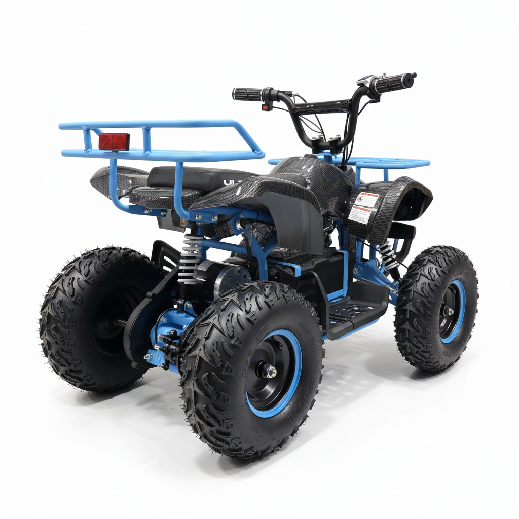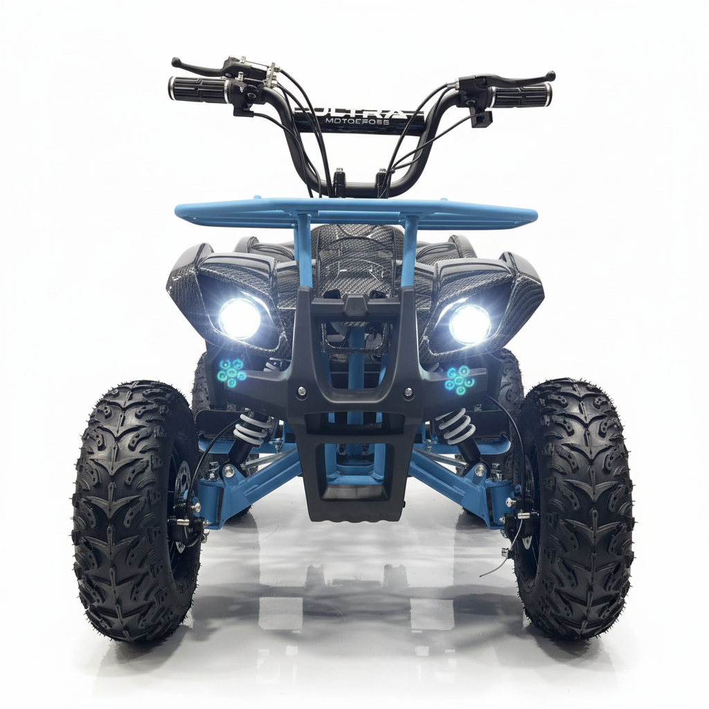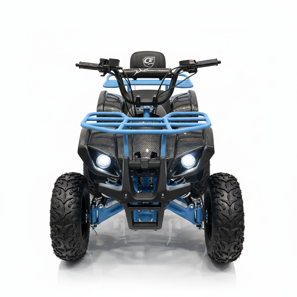 Deze elektrische kinderquad heeft een carbon look met blauwe accenten. Dit ziet er fenomenaal uit. De stoere uitstraling wordt nog eens versterkt dankzij de felle ledverlichting. Bijkomend voordeel van deze verlichting is dat de quad te allen tijde goed zichtbaar is. Deze kinderquad kan zowel voor- als achteruit rijden en het is een fluitje van een cent om deze kinderquad te bedienen. Deze 1000 watt brushless kinderquad heeft ook een neutrale stand. De maximale snelheid van deze elektrische kinderquad is 30 km/u. Je kunt de maximale snelheid ook instellen op 5 km/u of 15 km/u met behulp van de uitneembare sleutel. Zo behoud je als ouder zelf de controle. De bagagedrager voor en achter is perfect voor het vervoeren van diverse spullen.