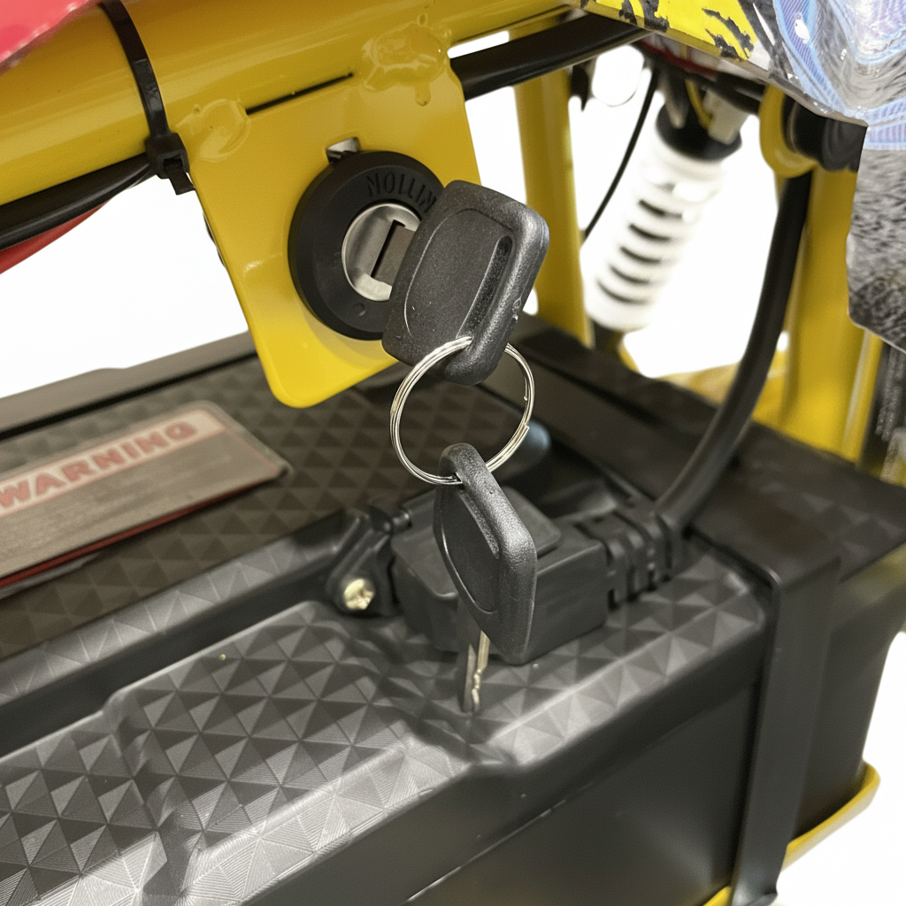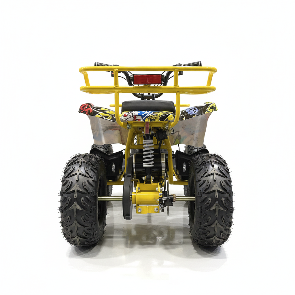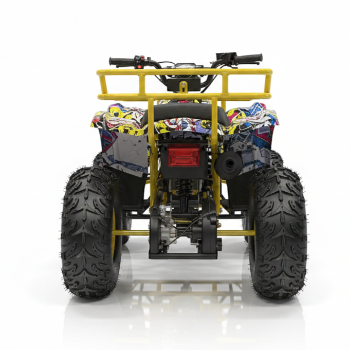 Deze elektrische kinderquad is geel van kleur voorzien van een speciale print. Dit ziet er fenomenaal uit. De stoere uitstraling wordt nog eens versterkt dankzij de felle ledverlichting. Bijkomend voordeel van deze verlichting is dat de quad te allen tijde goed zichtbaar is. Deze kinderquad kan zowel voor- als achteruit rijden en het is een fluitje van een cent om deze kinderquad te bedienen. Deze 1000 watt brushless kinderquad heeft ook een neutrale stand. De maximale snelheid van deze elektrische kinderquad is 30 km/u. Je kunt de maximale snelheid ook instellen op 5 km/u of 15 km/u met behulp van de uitneembare sleutel. Zo behoud je als ouder zelf de controle. De bagagedrager voor en achter is perfect voor het vervoeren van diverse spullen.