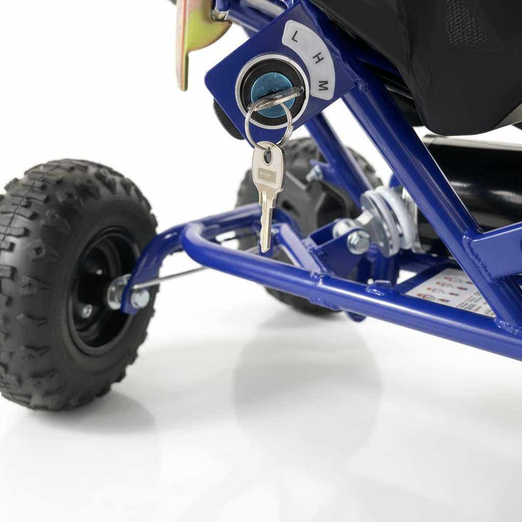 Deze elektrische kinderquad is blauw van kleur. Dit ziet er fenomenaal uit. De stoere uitstraling wordt nog eens versterkt dankzij de felle ledverlichting. Bijkomend voordeel van deze verlichting is dat de quad te allen tijde goed zichtbaar is. Door de luide claxon weet iedereen dat je eraan komt. Deze kinderquad kan zowel voor- als achteruit rijden en het is een fluitje van een cent om deze kinderquad te bedienen. Deze 1000 watt brushless kinderquad heeft ook een neutrale stand. De maximale snelheid van deze elektrische kinderquad is 30 km/u. Je kunt de maximale snelheid ook instellen op 5 km/u of 15 km/u met behulp van de uitneembare sleutel. Zo behoud je als ouder zelf de controle.