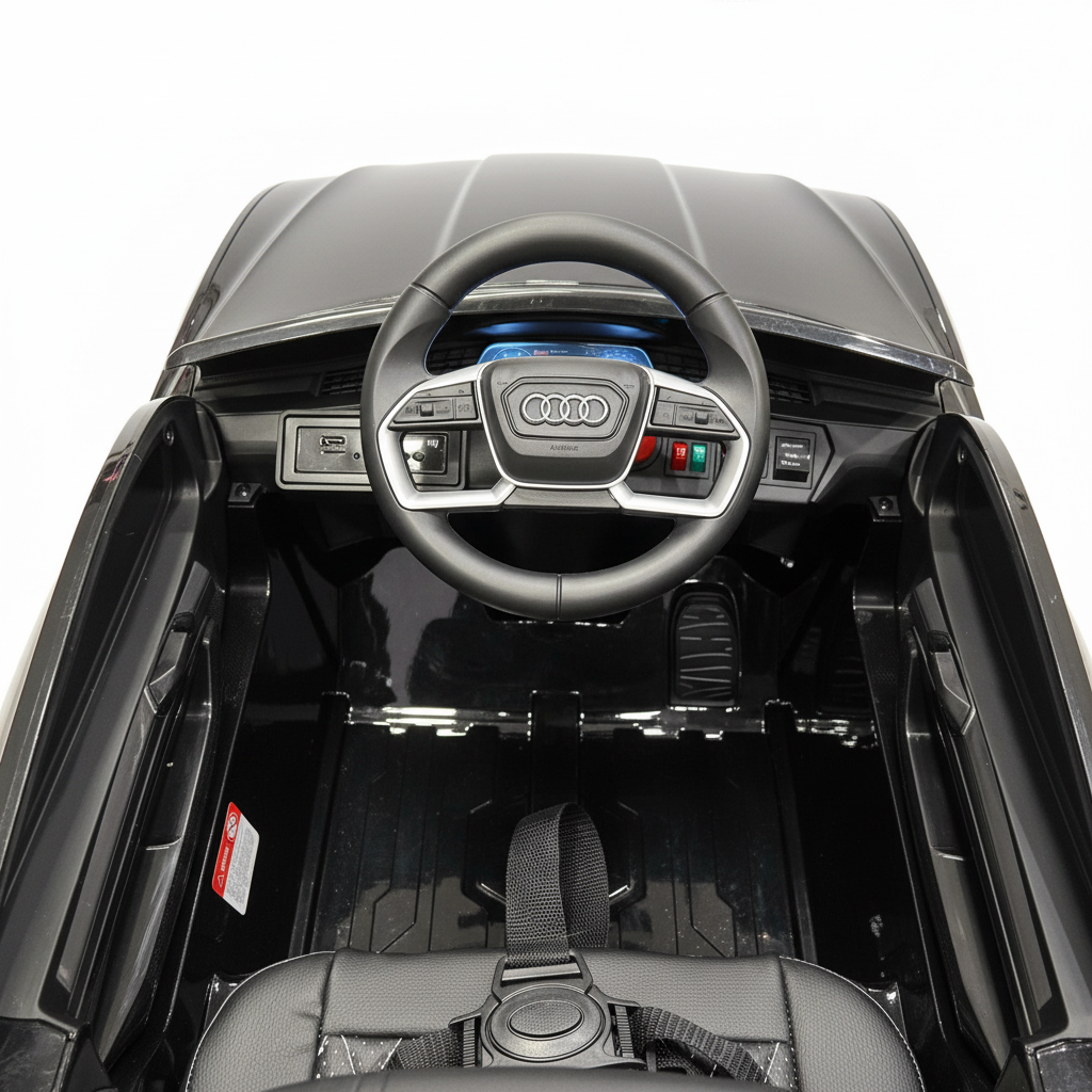 De Audi E-tron beschikt over rubberen banden en leren stoel. Dit zorgt voor een extra comfortabele rit. De Audi E-tron is uitgerust met een 5-puntsgordel en is dus geschikt voor de allerkleinsten. Zijn de kinderen wat ouder dan kunnen zij de kinderauto gemakkelijk besturen met het gaspedaal en stuur. Het stuur beschikt over leuke knopjes voor muziek en de claxon.