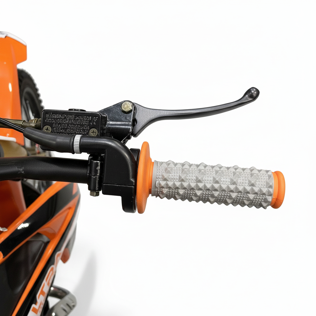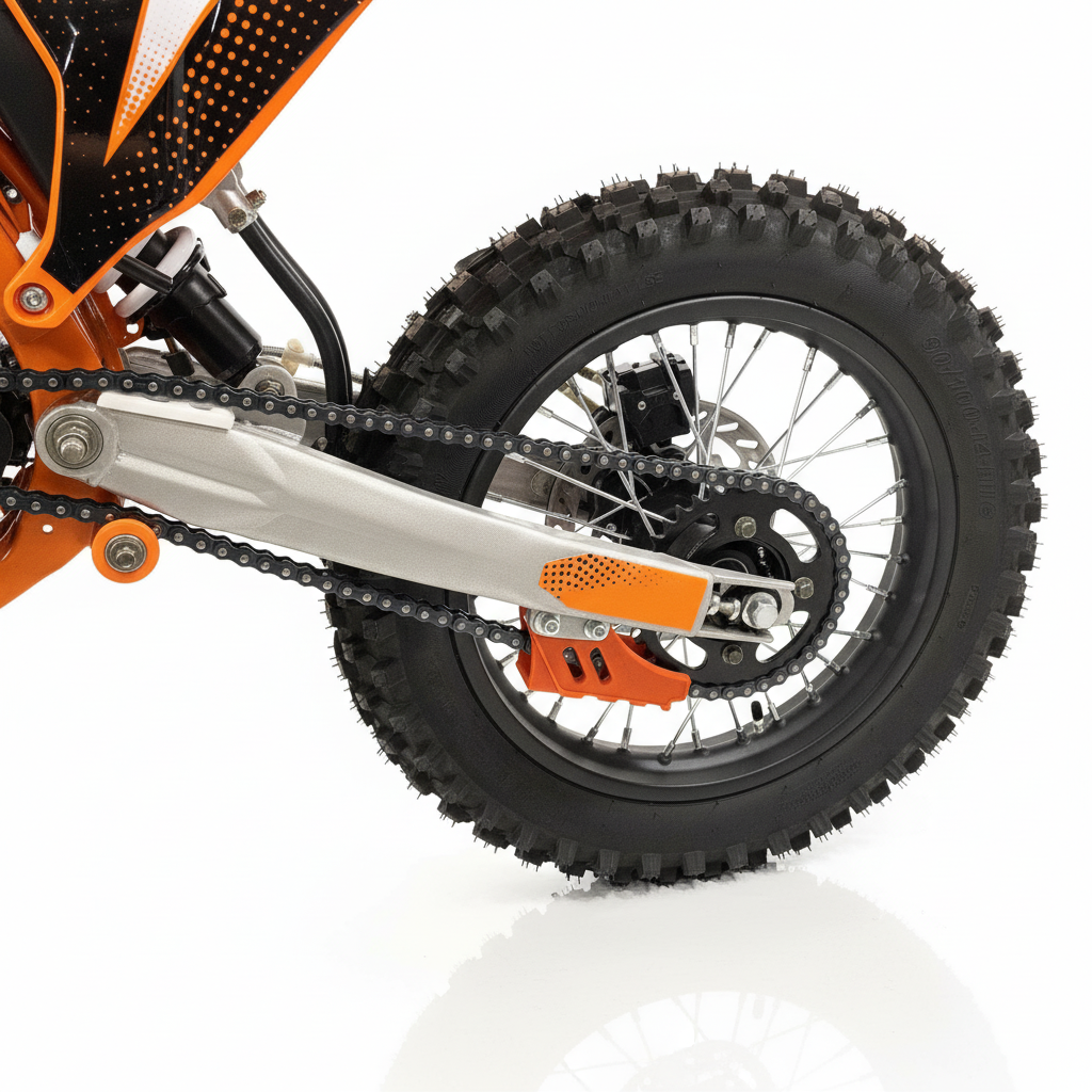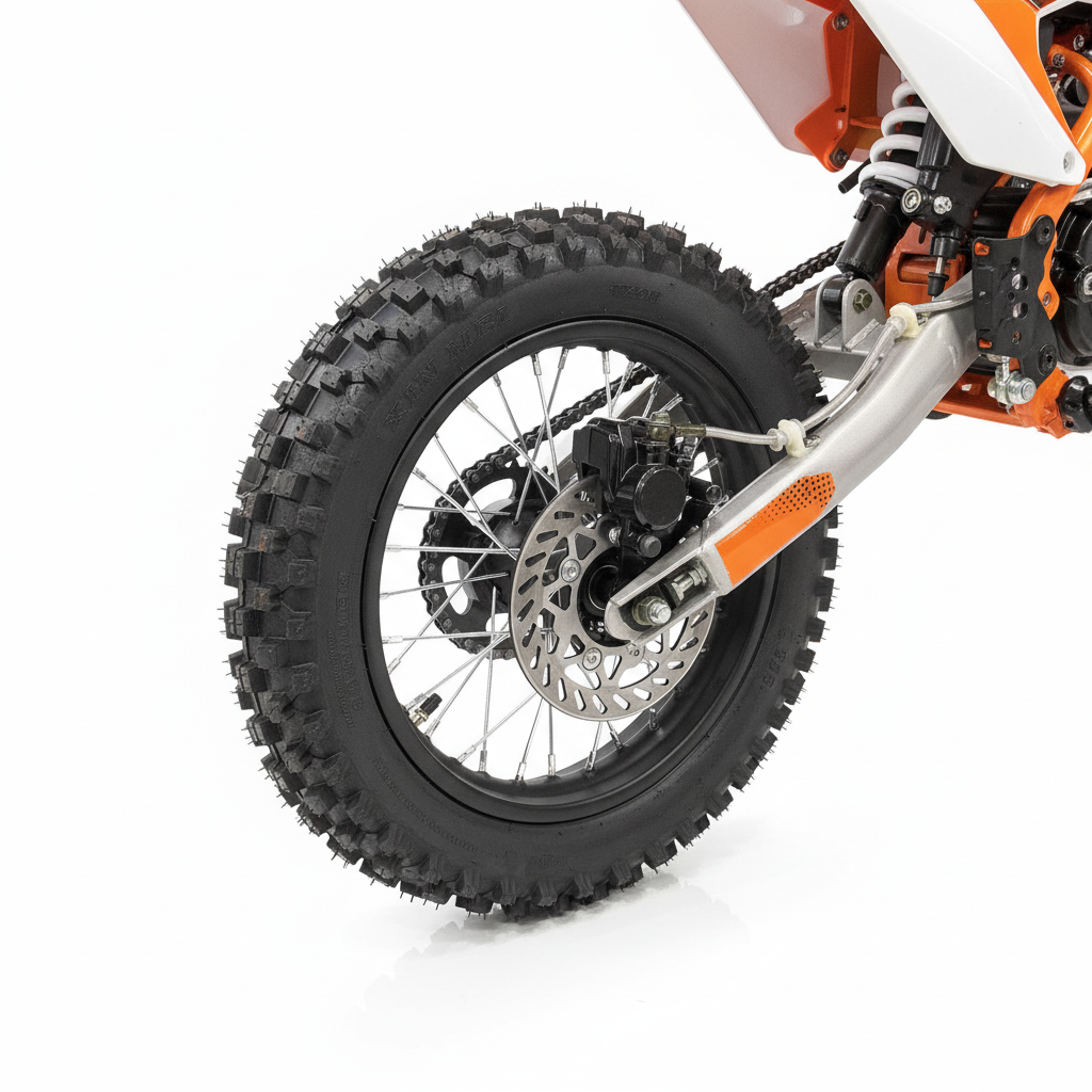 Het frame van deze crosser staat als een huis dit komt doordat de frame is vervaardigd uit chromoly staal, dit is hetzelfde materiaal als dat word gebruikt voor het maken van rolkooien in professionele race auto's. Hierdoor is de frame bijna onverwoestbaar! Combineer dat met de uitstekend werkende veringen, vermogen, betrouwbaarheid, uitstraling en je snapt wel waarom dit model tot de meest robuuste crossers van dit moment behoort. Deze pitbike kan opstarten dankzij de kick-starter. De transmissie verloopt doormiddel van de 4 versnellingen op de crosser. Met behulp van fastgrip gashendel kan er gas gegeven worden.
