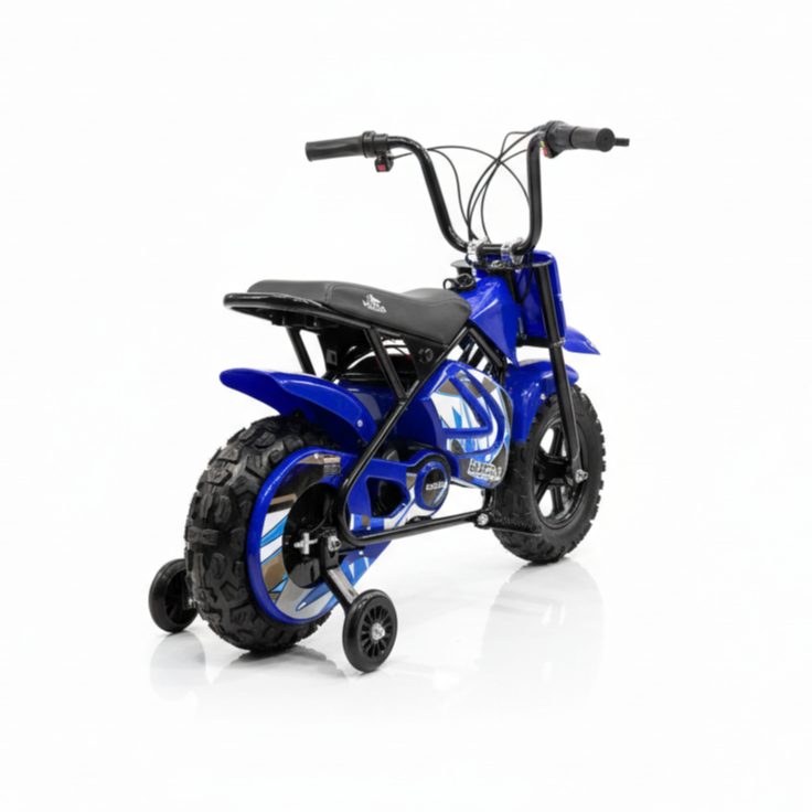 Deze Elektrische minicross bike 24V Blauw is nieuw in ons aanbod en geschikt voor alle beginnende crossertjes. De vormgeving ziet er fantastisch uit dankzij de combinatie van blauwe en zwarte kleuren. Zo ontstaat er een stoere kindermotor waarmee je kind gezien mag worden. Maar er zijn nog meer redenen om voor deze blauwe elektrische kindercrosser te kiezen. Zo beschikt dit model over afneembare zijwielen, een brushless motor en een 24V accu, waarmee het de ultieme elektrische crosser is voor de allerkleinste. Daarom bestel je dit model bij CarKiddo. Liever een maatje groter met meer vermogen? In dat geval kies je voor deze Elektrische Kindercrosser 1000W Oranje.