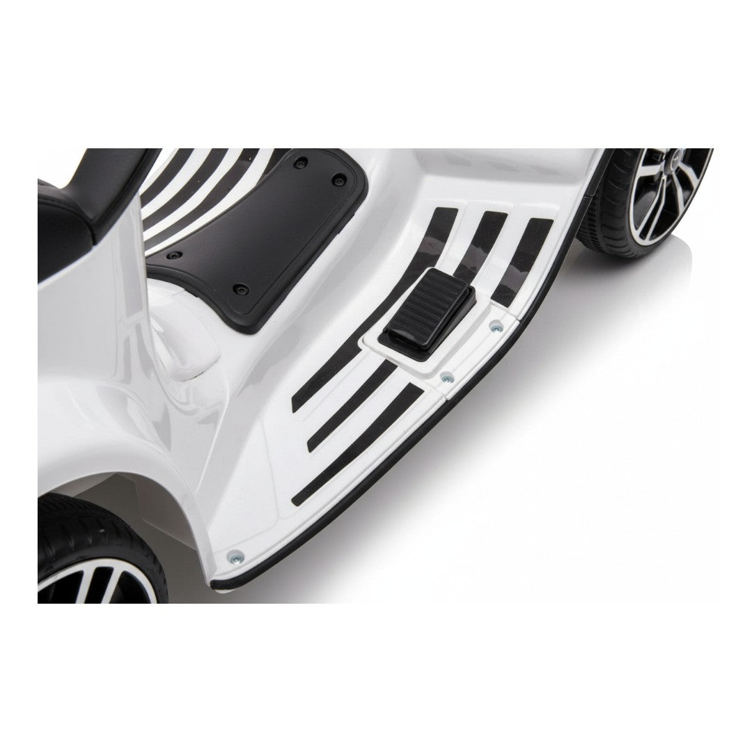 Deze Vespa scooter voor je kind is compleet veilig dankzij de steunwielen. Deze wielen voorkomen dat je kind om kan vallen. De kinderscooter kan zowel voor als achteruit rijden (maximaal 5 km/u) en is voorzien van een gaspedaal. Deze Kinder Vespa remt vanzelf op het moment dat er gestopt wordt met gas geven. Dankzij de claxon is deze scooter altijd te horen. In deze elektrische Vespa voor je kind zijn een USB- en AUX aansluiting te vinden. Tijdens het rijden kan je kind dus luisteren naar zijn of haar favoriete muziek.