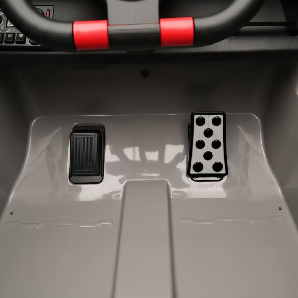 De ingebouwde motor over de 4-wielaandrijving wordt gestart via een voetbediende gaspedaal (of meegeleverde afstandsbediening), waarna de snelheid volledig traploos wordt opgebouwd. Geen abrupte versnellingen, maar een vloeiende, natuurlijke acceleratie die zorgt voor rust en controle tijdens het rijden. De onafhankelijke elektronische rempedaal garandeert een stabiele en veilige stop, ongeacht de situatie.